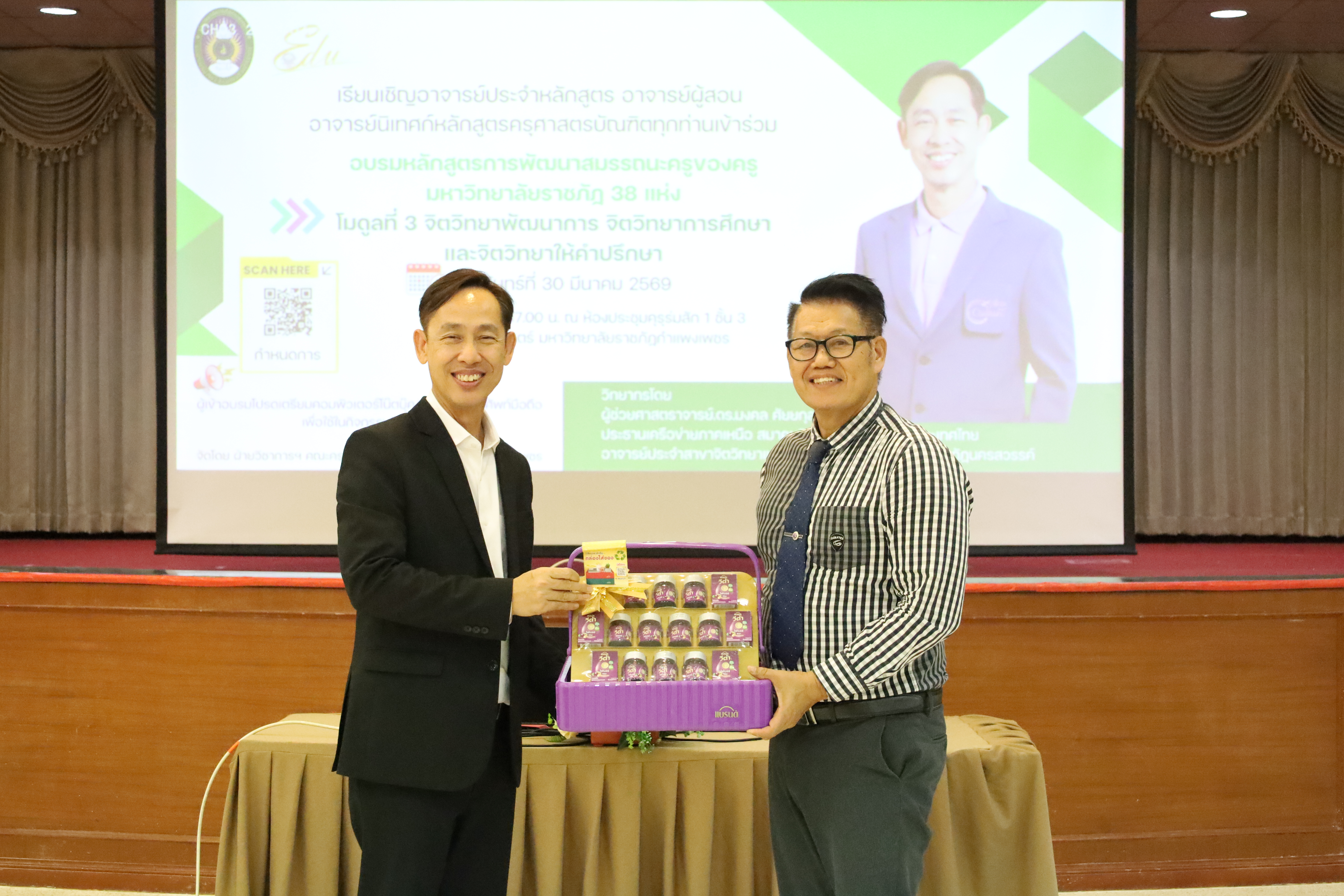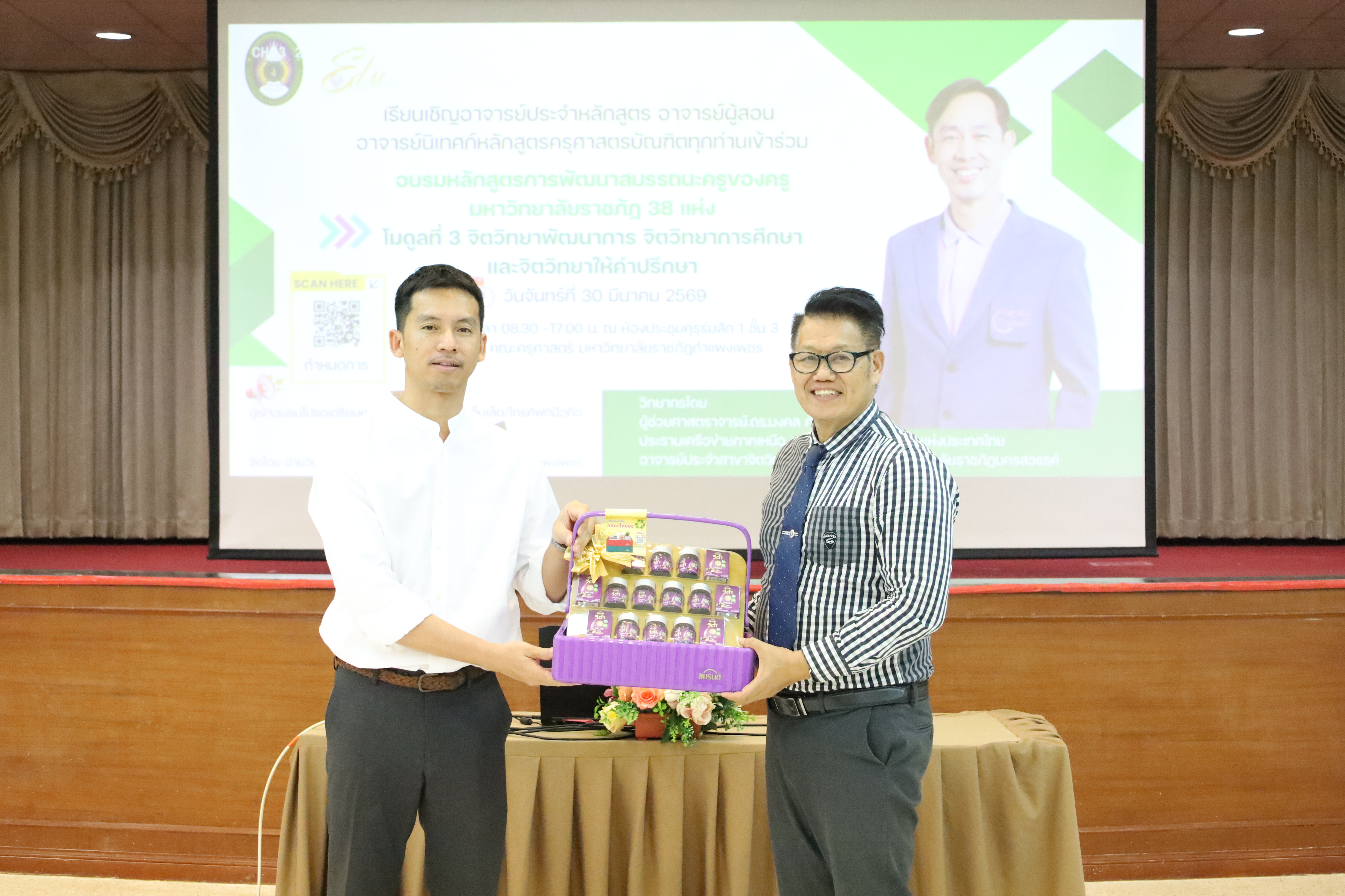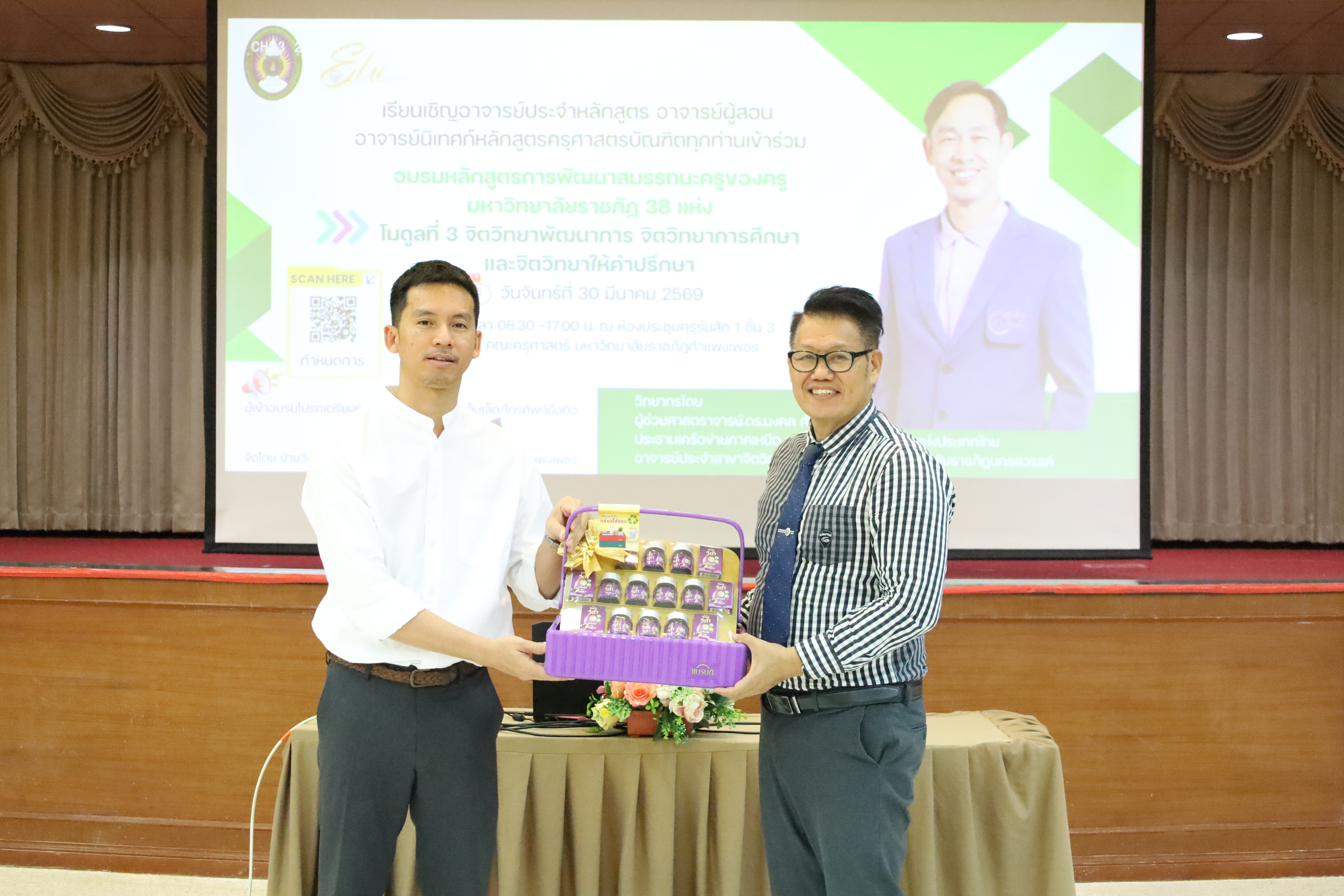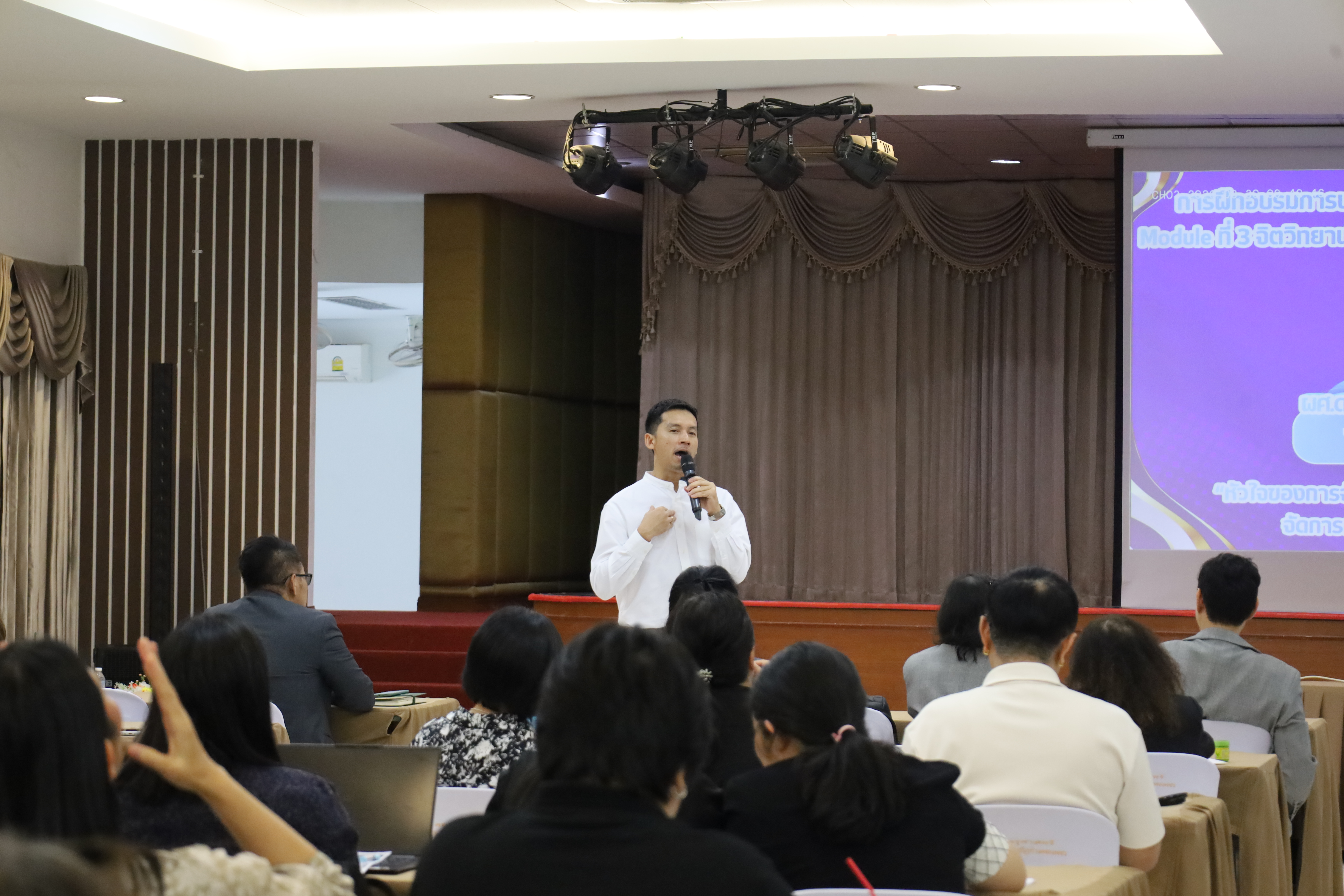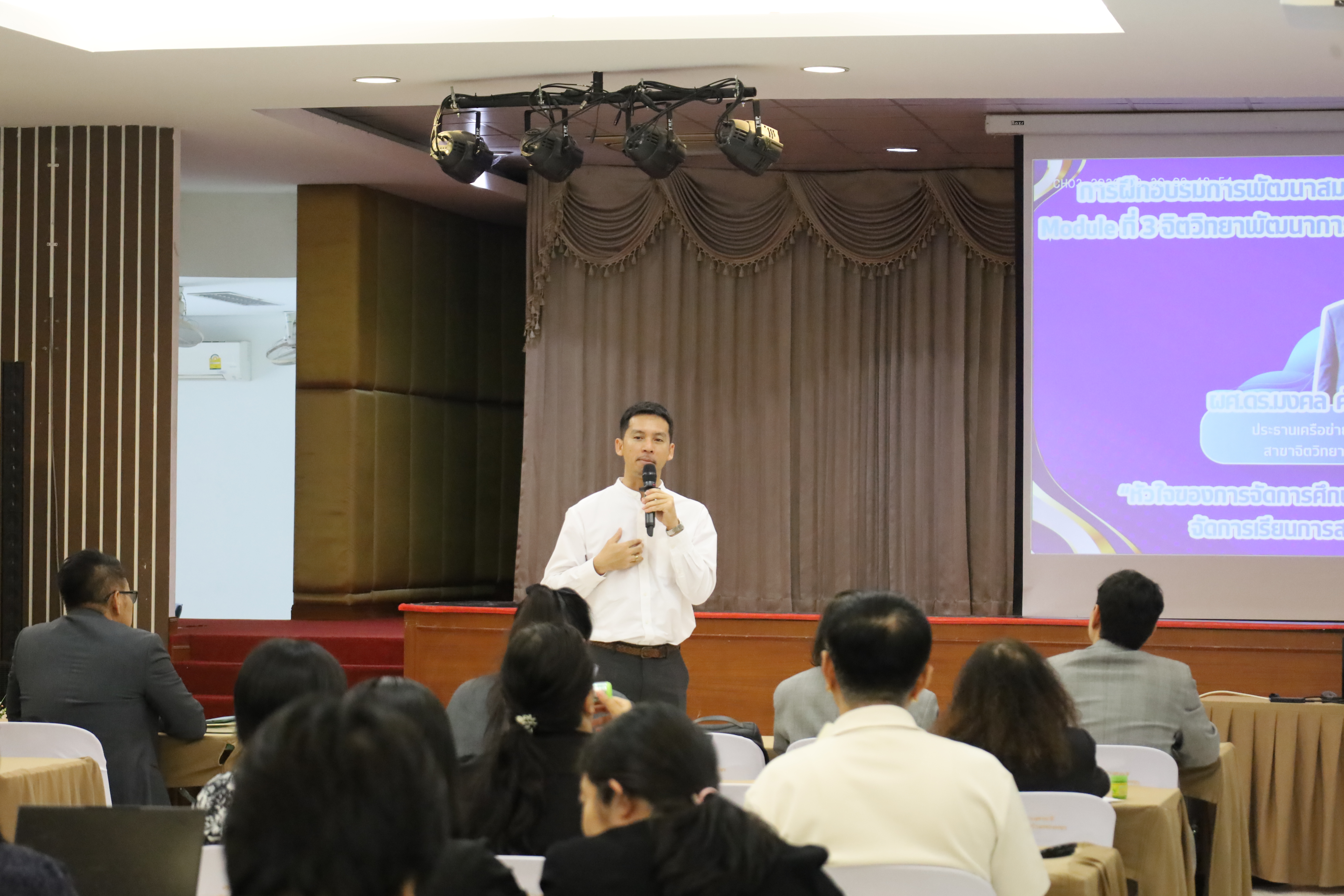 และ โมดูลที่ 10 ทักษะการโค้ชเพื่อการพัฒนา Soft Skills โดยได้รับเกียรติจากวิทยากรผู้ทรงคุณวุฒิจากหลากหลายสถาบัน และในวันนี้เป็นการอบรมในโมดูลแรก ได้แก่ โมดูลที่ 3 เรื่อง “จิตวิทยาพัฒนาการ จิตวิทยาการศึกษา และจิตวิทยาการให้คำปรึกษา” ซึ่งได้รับเกียรติจาก ผู้ช่วยศาสตราจารย์ ดร.มงคล ศัยยกุล ประธานเครือข่ายภาคเหนือ สมาคมจิตวิทยาแนะแนวแห่งประเทศไทย และอาจารย์ปกฉัตร กุสุโมทย์ อาจารย์ประจำสาขาจิตวิทยาและการแนะแนว จากคณะครุศาสตร์ มหาวิทยาลัยราชภัฏนครสวรรค์